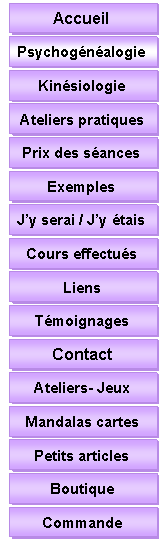 Dessiner un arbre généalogique. En y inscrivant les prénoms, les dates de naissance, de mariage, de divorce, de décès et les événements principaux de leur vie ainsi que les maladies principales. Il convient de faire cette recherche pour les frères et sœurs, les parents, les oncles et tantes, les grands-parents et leurs frères et sœurs, si possible sur 5 générations. Il n'est pas toujours facile d'obtenir toutes les données et c’est normal, mais on peut déjà trouver beaucoup de choses avec quelques indications ici et là. Même si l'arbre n'est pas complet, bien des préoccupations peuvent être éclairées. Cela demande du travail et du temps mais vous en serez récompensé. Et je suis là pour vous guider. La compréhension de votre histoire m'est nécessaire pour vous aider à découvrir la mise en place des schémas qui vous bloquent, vous gênent. S'il manque des données, la kinésiologie est là pour amener des éclaircissements La connaissance libère et l’amour de soi guérit !